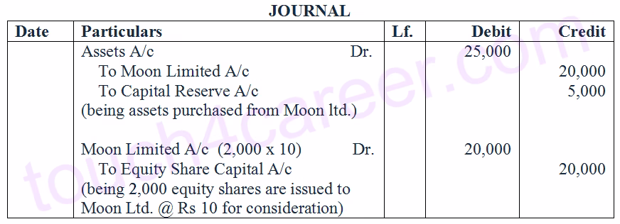 38 :- 2,000 Equity shares of Rs 10 each were issued to Moon Limited from whom assets of Rs 25,000 were acquired. Pass Journal entry.
