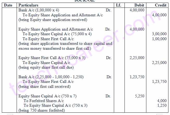 Applications for 1,00,000 shares were received. Shares were allotted to all the applicants on pro-rata basis and excess money received with applications was transferred towards sums due on first call. Vibha who was allotted 750 shares failed to pay the first call. Her shares were immediately forfeited. Afterwards, the second call was made. The amount due on second call was also received, except on 1,000 shares applied by Monika. Her shares were also forfeited. All the forfeited shares were reissued to Mohit for Rs 9,000 as fully paid up.