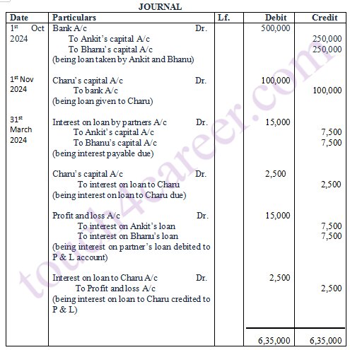 11 :- Ankit, Bhanu, and Charu are partners in a firm sharing profits and losses equally with a capital of Rs 2,50,000 each. On 1st October, 2024, Ankit and Bhanu gave loans of Rs 2,50,000 each to the firm whereas Charu took a loan of Rs 1,00,000 from the firm on 1st November, 2024. It was agreed among the partners that Charu will be charged interest @ 6% p.a.. Interest on loans from partners was paid on 10th April, 2025. The firm closes its books on 31st March each year.