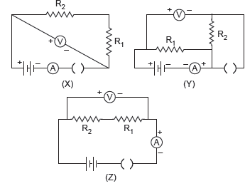 For determining the equivalent resistance of two resistors R1 and R2 connected in series, three students X, Y and Z set up their circuits as shown below: