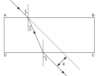 44. A student has traced the path of ray of light through a glass slab as follows. If you are asked to label 1, 2, 3 and 4, the correct sequence of labelling ∠i, ∠e, ∠r and lateral displacement respectively is