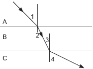 A ray of light is incident as shown. If A, B and C are three different transparent media, then which among the following options is true for the given diagram?