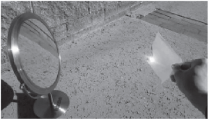 38. The image below shows a student demonstrating that sun-rays concentrated to a point using a spherical mirror can burn a paper as a science project