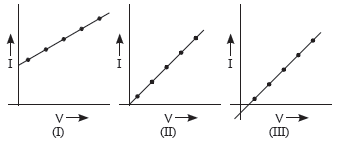 4. In the experiment on studying the dependence of current (I) and potential difference (V), three students plotted the following graph between (V) and (I) as per their respective observations.