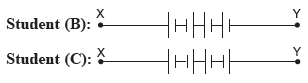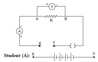 17. To the terminals marked as X and Y in the given circuit, three students connect 4 cells of voltage 1.5 V each in three different manners shown below.