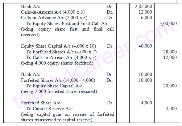 80 :- Park Hospitality Ltd. Incorporated with authorised capital of Rs 15,00,000, Rs 1,50,000 equity shares of Rs 10 each, issued 1,00,000 equity shares for subscription payable Rs 4 on application, Rs 3 on allotment and balance as first and final call. The shares were subscribed, and due amounts were received except first and final call on 4,000 shares held by Pawan. Rakesh holding 2,000 shares paid call on his shares along with allotment money. Shares of Pawan were forfeited. Later, half of the shares were reissued as fully paid-up and Rs 4,000 were transferred to Capital Reserve. Pass the Journal entry for reissue of shares.