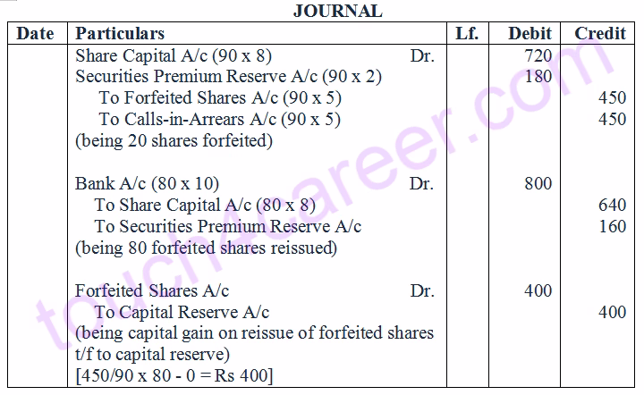 (ii) Y Ltd. Forfeited 90 shares of Rs 10 each, Rs 8 called-up issued at a premium of Rs 2 per share to ‘R’ for non-payment of allotment money of Rs 5 per share (including premium). Out of these, 80 shares were reissued to Sanjay as Rs 8 called-up for Rs 10 per share.