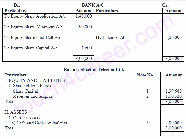 93 :- Telecom Ltd.; issued 20,000 Equity Shares of Rs 10 each at a premium of Rs 5 per share, payable as: Rs 7 (including premium) on application, Rs 5 on allotment and the balance after three months of allotment. A shareholder to whom 200 shares were allotted failed to pay the allotment and call money and his shares were forfeited. 160 of the forfeited shares were reissued for Rs 1,600.